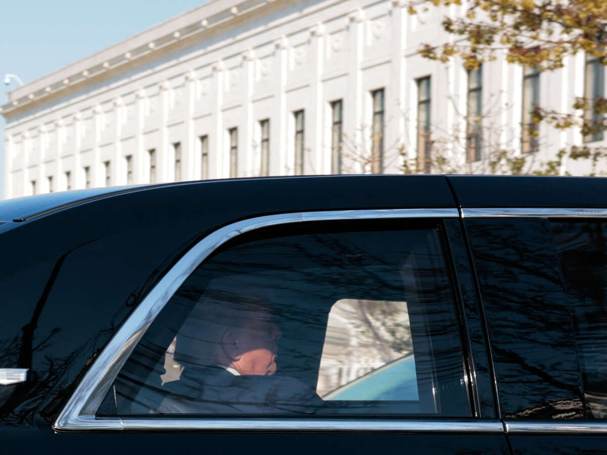 U.S. President Donald Trump rides in his motorcade as he arrives at the US Supreme Court in Washington, D.C. on April 1, 2026.