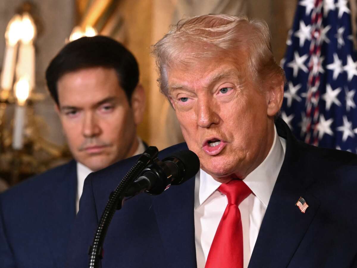 U.S. Secretary of State Marco Rubio looks on as U.S. President Donald Trump speaks after announcing the U.S. Navy’s new Golden Fleet initiative, unveiling a new class of warships, at Mar-a-Lago in Palm Beach, Florida, on December 22, 2025.