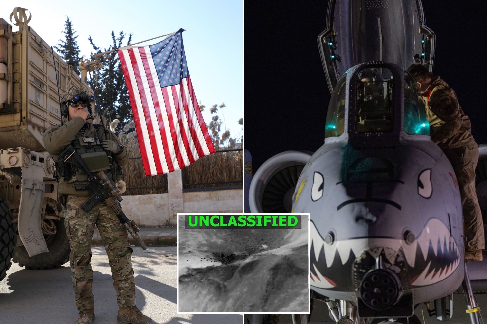 Un collage de imágenes que contiene 3 imágenes. La imagen 1 muestra a soldados de la coalición liderada por Estados Unidos haciendo guardia el día de una reunión entre los líderes de las Fuerzas Democráticas Sirias (SDF) y los líderes militares de Estados Unidos, en Deir Hafer. La imagen 2 muestra a un personal militar subiendo a un avión A-10 Thunderbolt II. La imagen 3 muestra una imagen abstracta en escala de grises con la palabra. "SIN CLASIFICAR" en verde en la parte superior