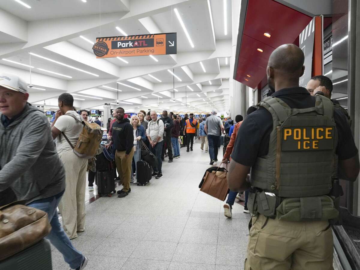 ICE agents look on as travelers stand in long lines at Atlanta Hartsfield-Jackson International Airport on March 23, 2026.
