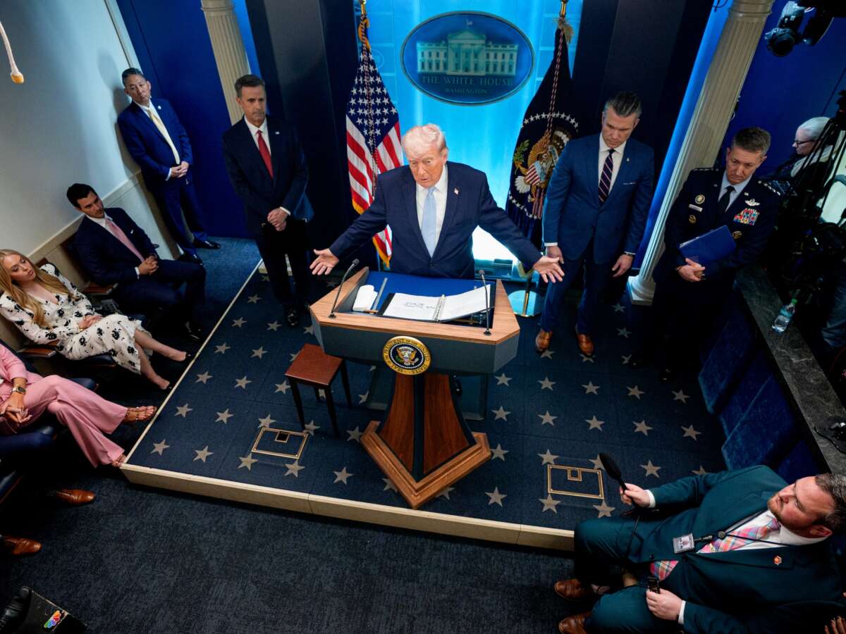 El presidente Donald Trump habla con periodistas durante una conferencia de prensa en la sala de prensa James Brady, con el secretario de Guerra Pete Hegseth y el presidente del Estado Mayor Conjunto, general Dan Caine, en la Casa Blanca en Washington el 6 de abril de 2026. (Mark Schiefelbein/AP Photo)